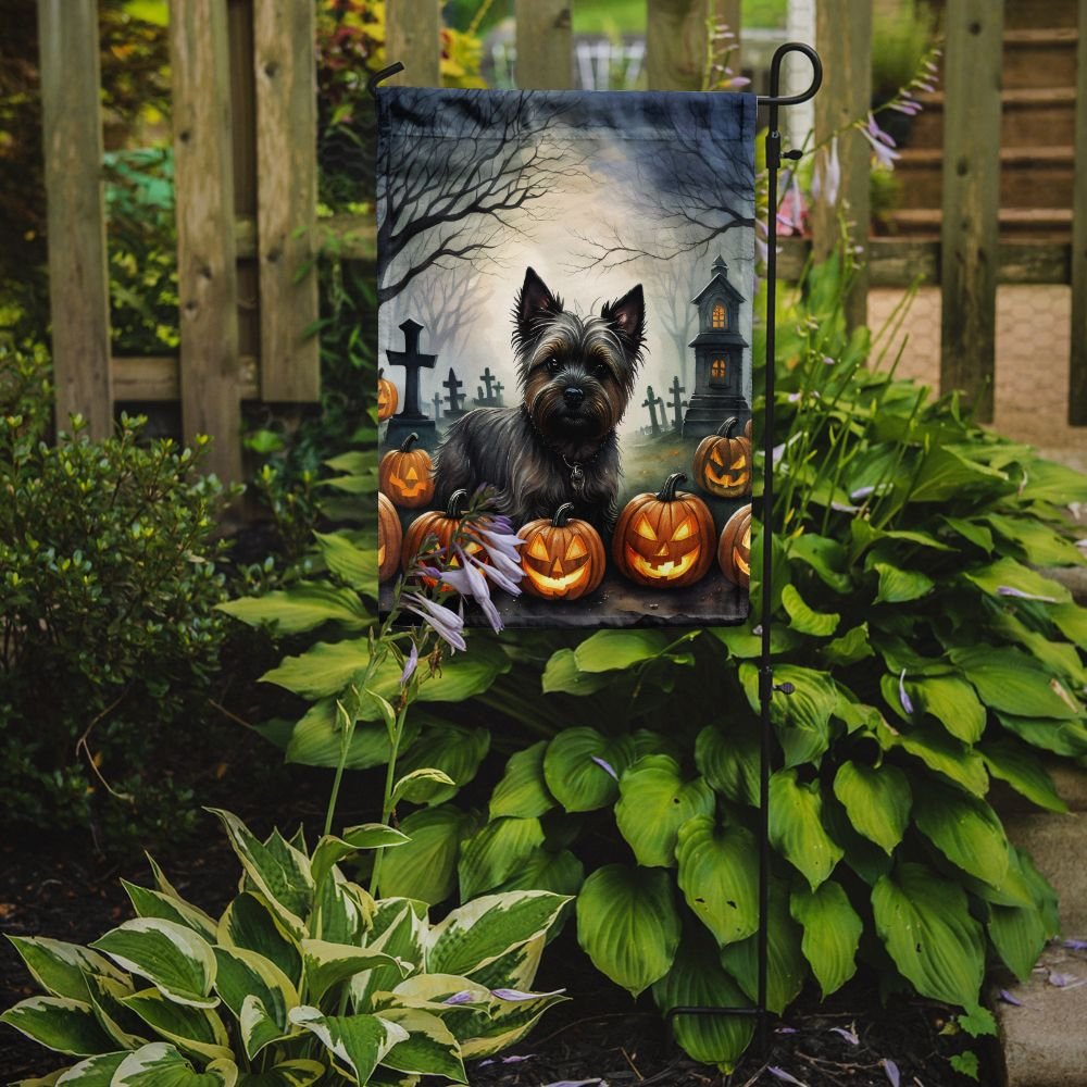 Garden Flag featuring breed specific Cairn Terrier artwork. Celebrate Halloween with this Halloween Garden Flag. Enhance the beauty of your garden, patio, or yard with Caroline's Treasures Decorative Garden Flag, proudly made in the USA. Crafted from two pieces of thick, double-sided polyester fabric, this 2-ply garden flag is designed to withstand various weather conditions, making it water-resistant and weatherproof. Featuring correctly readable words on both sides, this garden flag offers a delightful visual experience from any angle. With its heavier weight, it stands out among other garden flags, ensuring stability and durability even in wind, rain, and snow. Measuring approximately 11 1/4 inches by 15 1/2 inches, this flag allows you to personalize your outdoor decor. It comes with a 1 1/2-inch sleeve sewn in, allowing easy attachment to any standard garden flag stand or garden size porch hanger (sold separately). Make a statement in your outdoor space with Caroline's Treasures Decorative Garden Flag, a vibrant and high-quality flag that adds color and personality to your surroundings. Proudly made in the USA, it's a symbol of quality craftsmanship and attention to detail.