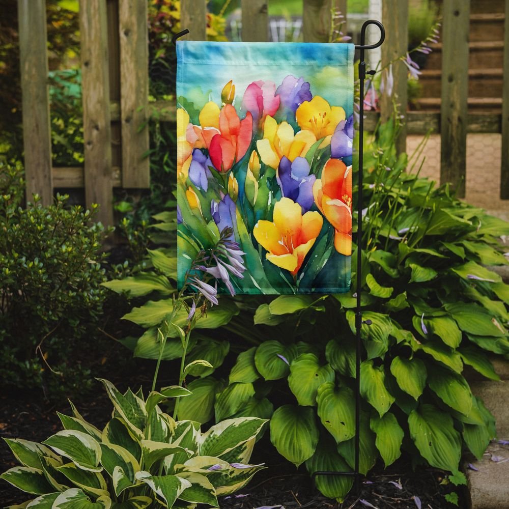 Garden Flag featuring breed specific Freesias artwork. Enhance the beauty of your garden, patio, or yard with Caroline's Treasures Decorative Garden Flag, proudly made in the USA. Crafted from two pieces of thick, double-sided polyester fabric, this 2-ply garden flag is designed to withstand various weather conditions, making it water-resistant and weatherproof. Featuring correctly readable words on both sides, this garden flag offers a delightful visual experience from any angle. With its heavier weight, it stands out among other garden flags, ensuring stability and durability even in wind, rain, and snow. Measuring approximately 11 1/4 inches by 15 1/2 inches, this flag allows you to personalize your outdoor decor. It comes with a 1 1/2-inch sleeve sewn in, allowing easy attachment to any standard garden flag stand or garden size porch hanger (sold separately). Make a statement in your outdoor space with Caroline's Treasures Decorative Garden Flag, a vibrant and high-quality flag that adds color and personality to your surroundings. Proudly made in the USA, it's a symbol of quality craftsmanship and attention to detail.