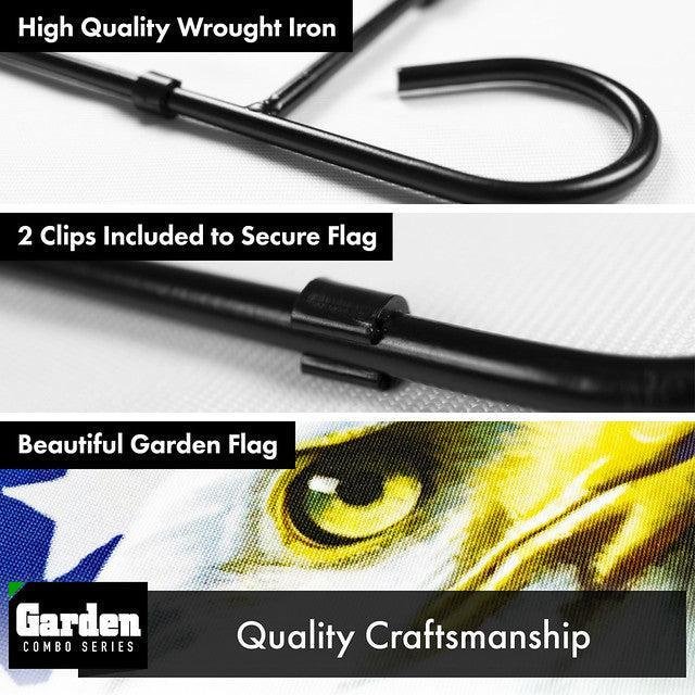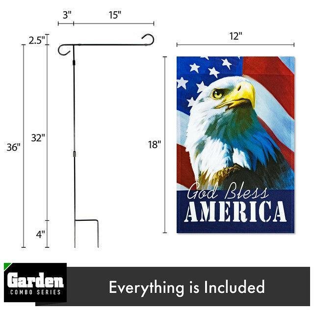 Combo Pack Garden Flag Stand Black 36x16 Inch & Garden Flag God Bless America USA Flag with Eagle 12x18 Inch
