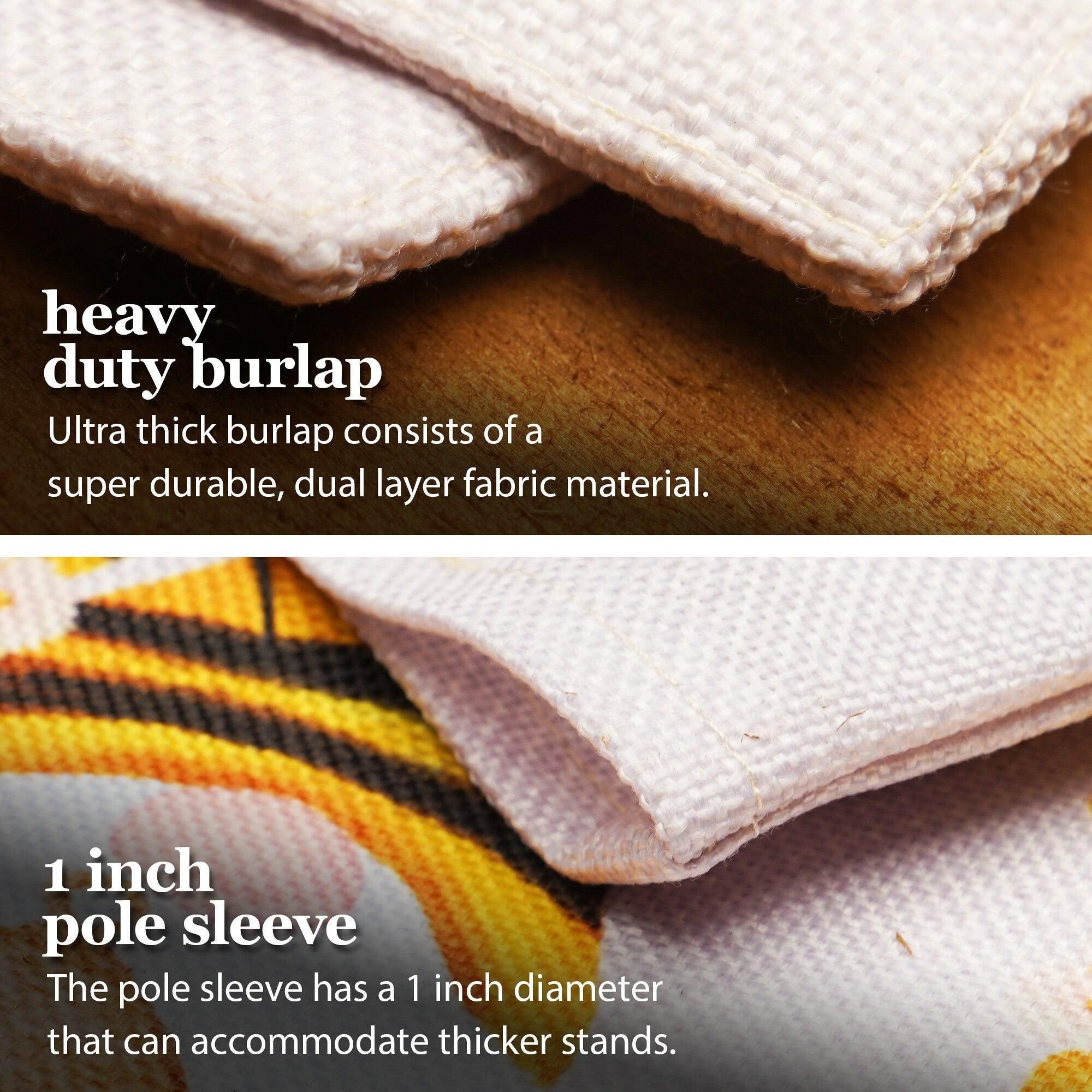 2.rusting and fading, great for outdoor use! decorative: this combo set will add liveliness to your front door or backyard garden.this combo is perfect for holidays, special events, seasons, everyday display, or as a gift for a loved one! specs: garden flag stand is 36" x 16" after assembly from black iron 3 piece set; flag is a 12"x18" size double sided burlap garden flag. imported, 100% polyester